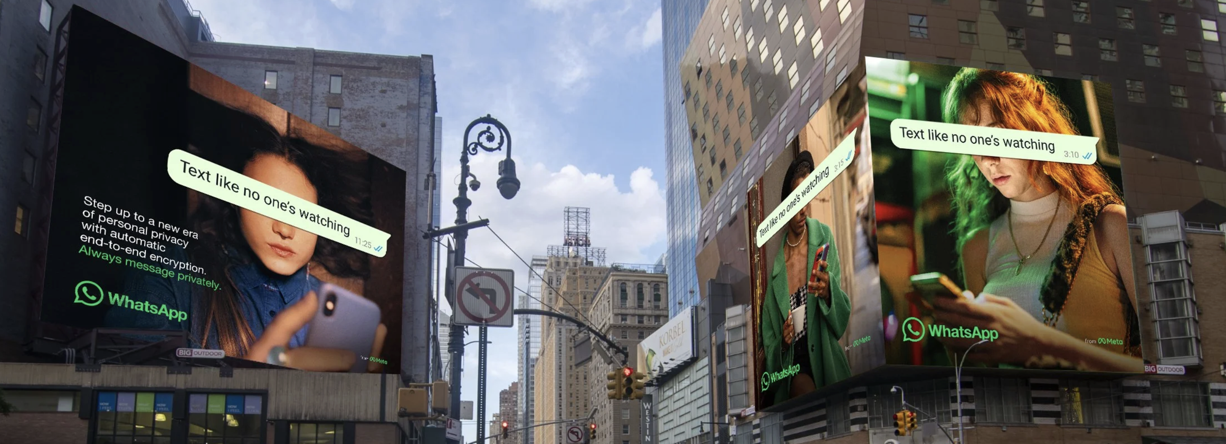 With digital privacy under constant threat, we set out to make WhatsApp’s promise unmistakable: every message you send is protected, from start to finish. Our OOH campaign took over LA, SF, and Times Square to put privacy front and center.